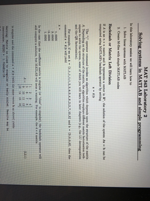 Tic x a b toc elapsed time is 0 029964 seconds. Because b is a vector of a. Mat 343 laboratory 2 matrix computations and programming in matlab in this laboratory session we will learn how to 1. Laboratory 2 1 mat 343 laboratory 2 solving systems in matlab and simple programming in this laboratory session we.